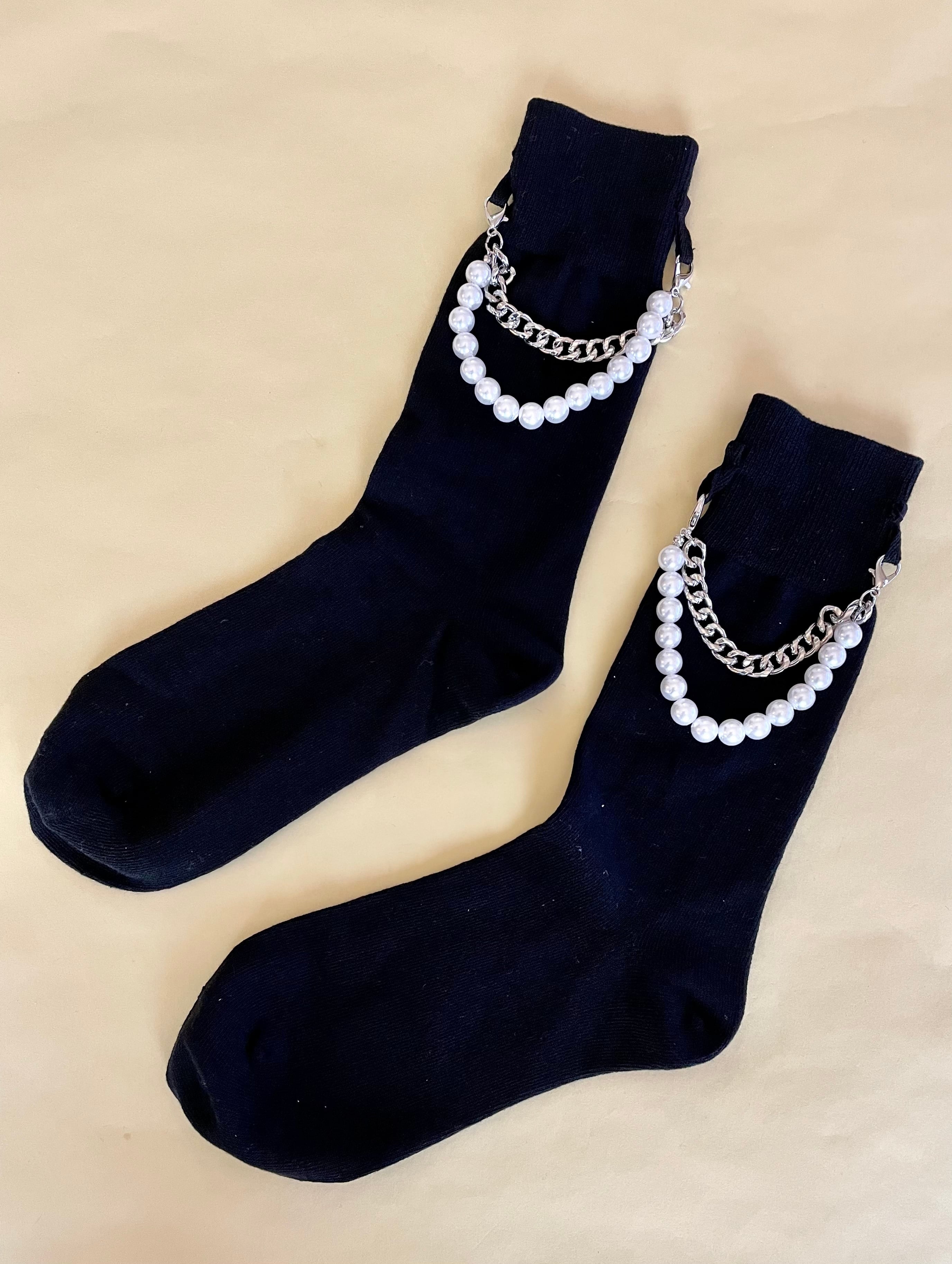 大粒のパールとシルバーのチェーンをあしらったソックスです